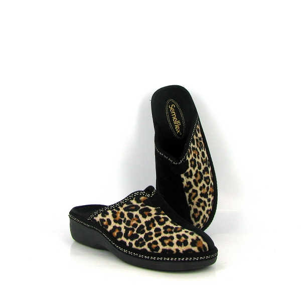 SEMELFLEX ALEXIA textile léopard Quel ravissement de porter ces chaussons Semelflex après une journée à marcher, confort et respect du pied garantis. Mule Semelflex ALEXIA - Motif léopard et noir - Semelle en caoutchouc, légère, résistante et souple, - Talon compensé de 3 cm, - Entièrement en textile chaud. Semeflex ALEXIA, dispo en ligne et dans vos magasins. Livraison chez vous en 48H !